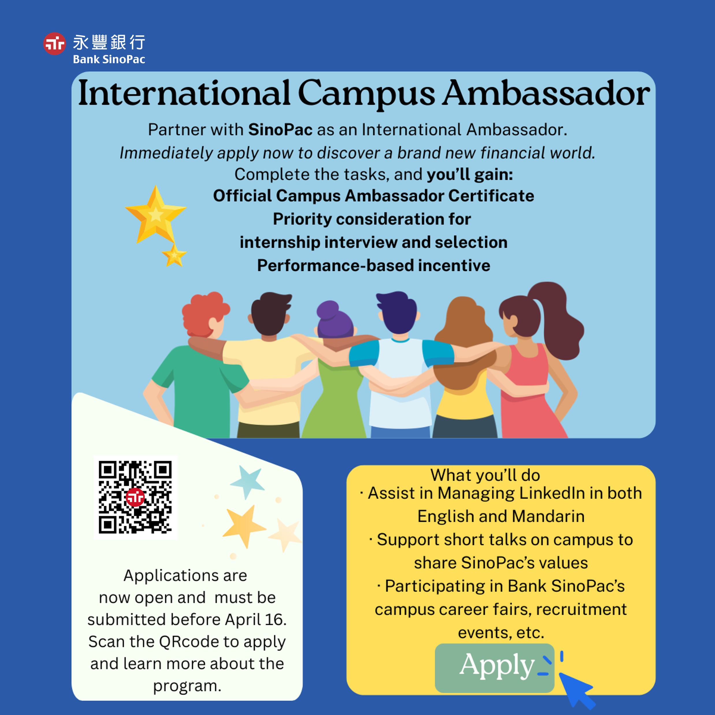 作為國際校園大使,你將成為永豐銀行在校園與國際學生社群中的代表。不僅能學習溝通與行銷技巧, 更能搭建國際學生與企業之間的橋樑,協助品牌在校園中建立更直接且多元的互動與連結。